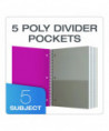 This five-subject poly notebook comes in bright colors and is three-hole punched to fit a standard binder. Includes five poly divider pockets and a strong no-snag coil. Comes in assorted colors.
