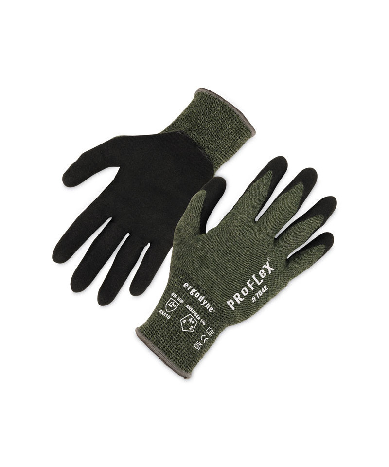The ProFlex 7042 Nitrile Coated Cut-Resistant Gloves are made with heavy-duty aramid fiber for heat handling and ANSI A4 cut resistance, plus durable sandy nitrile coated palms for high strength grip and enhanced dexterity. Unlike other bulky cut-resistant gloves, the 18-gauge aramid fiber knit protects hands from heat and cuts while maintaining a soft, lightweight and flexible form fit. The snug knit cuffs are longer than most on the market, a feature that enhances fit and extends protection while keeping dirt and debris out. These safety work gloves are tested to EN407 Level 1 contact heat resistance for safety when handling high temperature materials.