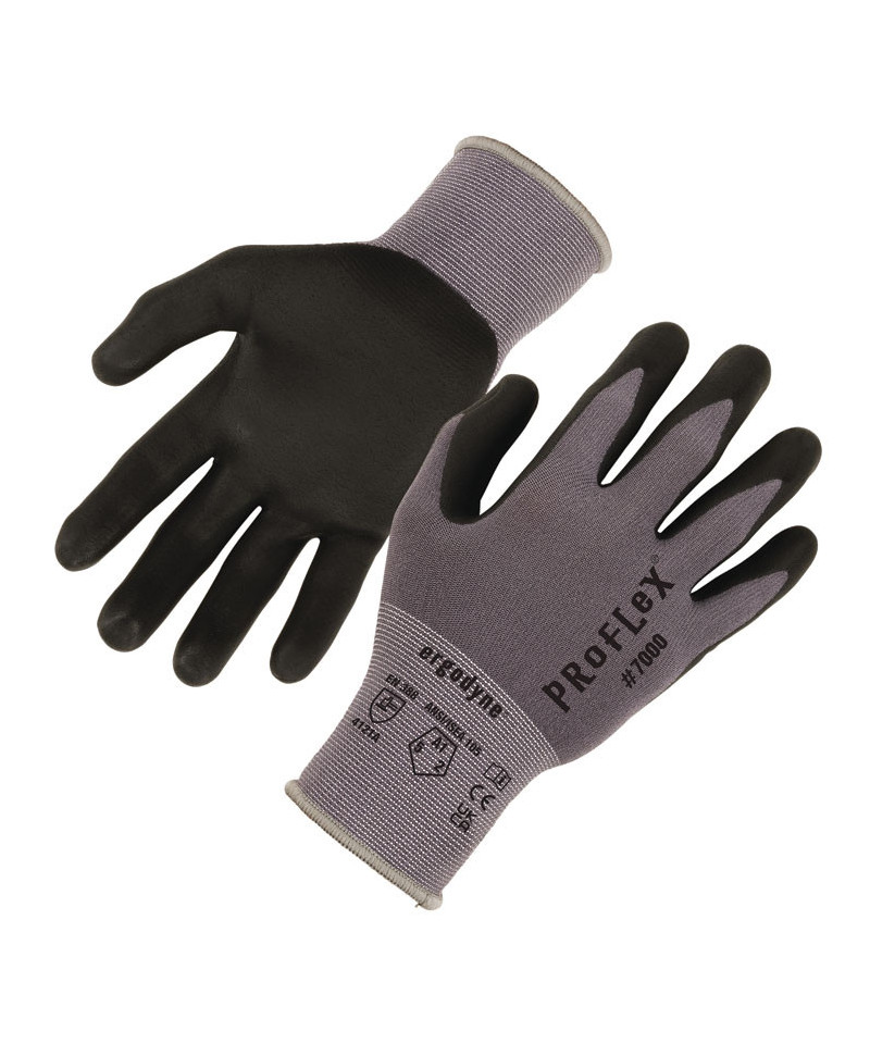 The ProFlex 7000 Nitrile Coated Gloves feature microfoam nitrile coated palms for excellent grip and dexterity with an ultra-lightweight and soft form fit. The 15-Gauge nylon-spandex knit is comfortably lightweight and flexible while still meeting ANSI Level 5 abrasion resistance for long lasting durability and general purpose protection against abrasive objects and surfaces. Gauge indicates the number of stitching rows per inch—a higher gauge will have more flexibility and less bulk. The snug knit cuffs are longer than most on the market, a feature that enhances fit and extends protection while keeping dirt and debris out. The palms of these safety gloves are dipped in a microfoam nitrile for excellent grip, dexterity and feel on a variety of surfaces.