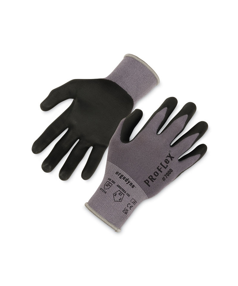 The ProFlex 7000 Nitrile Coated Gloves feature microfoam nitrile coated palms for excellent grip and dexterity with an ultra-lightweight and soft form fit. The 15-Gauge nylon-spandex knit is comfortably lightweight and flexible while still meeting ANSI Level 5 abrasion resistance for long lasting durability and general purpose protection against abrasive objects and surfaces. Gauge indicates the number of stitching rows per inch—a higher gauge will have more flexibility and less bulk. The snug knit cuffs are longer than most on the market, a feature that enhances fit and extends protection while keeping dirt and debris out. The palms of these safety gloves are dipped in a microfoam nitrile for excellent grip, dexterity and feel on a variety of surfaces.