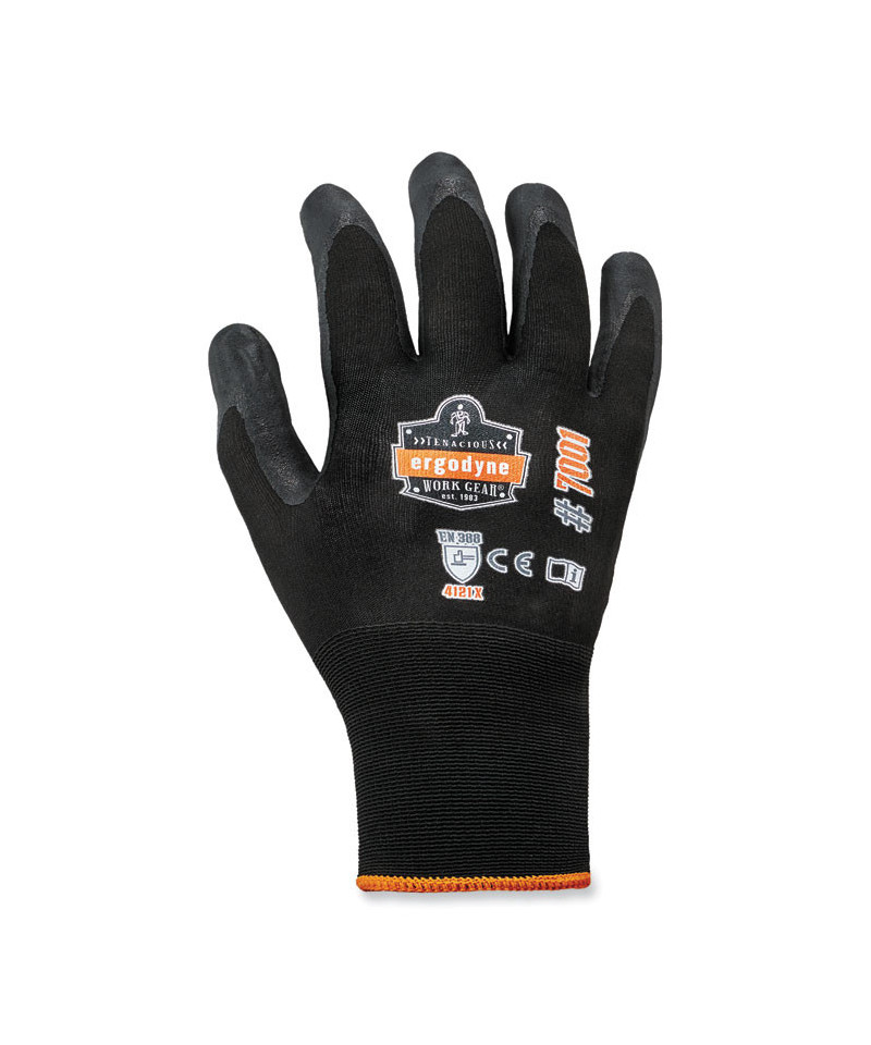 The ProFlex 7001 Nitrile Coated Gloves feature a durable DSX coating for optimal grip and dexterity in dry conditions. The 18-gauge nylon-spandex knit makes for a soft, lightweight and flexible form fit while still meeting ANSI level 2 abrasion resistance for safety around rough materials. Ideal for handling small parts, the combination of DSX coating and thin form-fitting knit delivers enhanced dexterity compared to bulkier safety gloves. The snug knit cuffs are longer than most on the market, a feature that enhances fit and extends protection while keeping dirt and debris out. Coated in two-layer DSX nitrile, a.k.a. (D)ry (S)urface E(X)treme, these utility work gloves are designed for optimal performance when handling dry materials and surfaces. The double layers of smooth abrasion-resistant nitrile boost glove durability and feel while remaining comfortably flexible for enhanced dexterity.