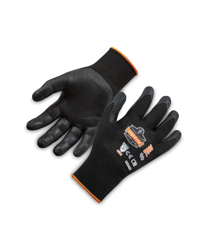 The ProFlex 7001 Nitrile Coated Gloves feature a durable DSX coating for optimal grip and dexterity in dry conditions. The 18-gauge nylon-spandex knit makes for a soft, lightweight and flexible form fit while still meeting ANSI Level 3 Abrasion Resistance for safety around rough materials. Ideal for handling small parts, the combination of DSX coating and thin form-fitting knit delivers enhanced dexterity compared to bulkier safety gloves. The snug knit cuffs are longer than most on the market, a feature that enhances fit and extends protection while keeping dirt and debris out. Coated in two-layer DSX nitrile, (D)ry (S)urface E(X)treme, these utility work gloves are designed for optimal performance when handling dry materials and surfaces. The double layers of smooth abrasion-resistant nitrile boost glove durability and feel while remaining comfortably flexible for enhanced dexterity with minimal hand fatigue.