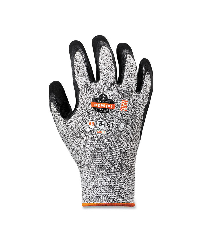 The ProFlex 7031 Nitrile-Coated Gloves feature sandy nitrile coated palms and thumb reinforcements for extra-strength grip and durability in rough environments. Rated to ANSI A3 cut protection and Level 4 abrasion resistance, the 13-gauge HPPE nylon-spandex knit protects hands from cuts, punctures and abrasions without compromising dexterity or comfort. The snug knit cuffs are longer than most on the market, a feature that enhances fit and extends protection while keeping dirt and debris out. Both the palms and thumbs of these safety gloves are coated with sandy nitrile for secure grip on even the roughest surfaces. Among the strongest coatings available, the sandy nitrile dip boosts glove durability while remaining comfortably flexible for enhanced dexterity and minimal hand fatigue.
