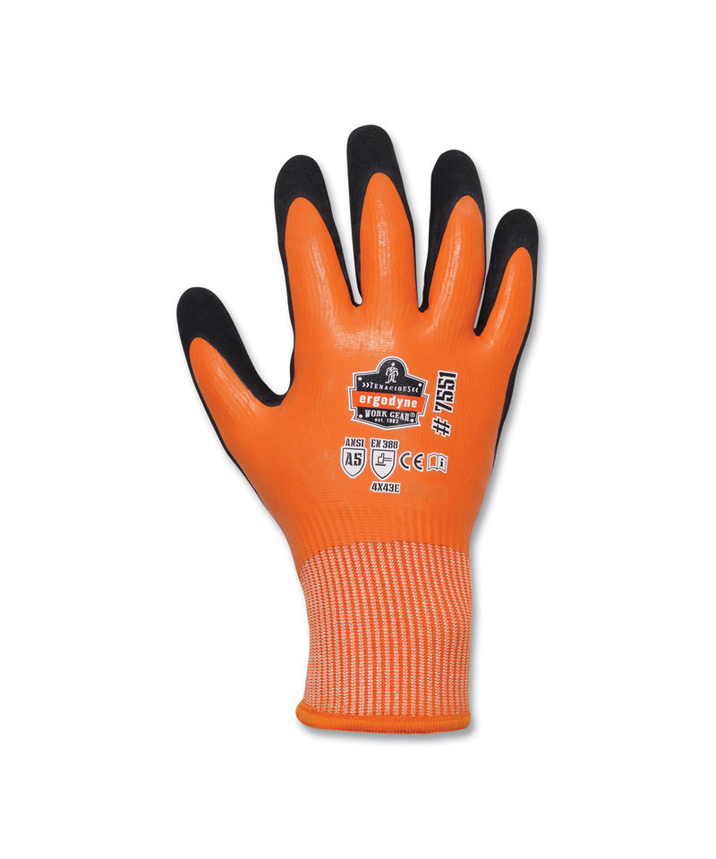 The ProFlex 7551 Coated Winter Work Gloves are dual layer for warm, waterproof, cut-resistant protection in cold temperatures. The 13-gauge A5 cut protection liner is cut, puncture and abrasion resistant for harsh winter environments. Fully coated in latex to keep hands dry with a second, sandy nitrile palm dip for superior grip. Wet hands are cold hands. These coated gloves feature a full waterproof latex dip that protects you from the elements by keeping water and cold air out, with a second layer of sandy nitrile on the palms for abrasion-resistance and enhanced grip without compromised dexterity. A double-lined, cut-resistant interior keeps hands toasty and comfortable without bulk. The 13 g high performance polyethylene (HPPE) provides ANSI level 5 cut and slash protection, while the 10 g brushed acrylic fleece adds soft warmth. These coated winter work gloves meet the EN 388: 4X43E standard for cut resistance.