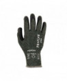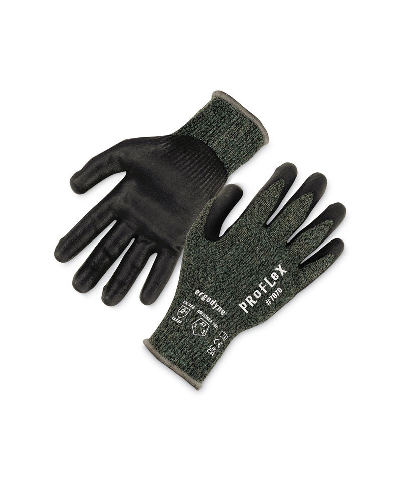 The ProFlex 7070 Nitrile Coated Cut-Resistant Gloves are made with heavy-duty aramid fiber for heat handling and ANSI A7 cut resistance, plus durable sandy nitrile coated palms for high strength grip and enhanced dexterity. The form-fitting 13-gauge aramid fiber knit protects hands from heat and cuts without compromising flexibility or comfort. The snug knit cuffs are longer than most on the market, a feature that enhances fit and extends protection while keeping dirt and debris out. These safety work gloves are tested to EN407 Level 1 contact heat resistance for safety when handling high temperature materials. A measure of how well the glove will insulate hands from heat, Level 1 contact heat resistance indicates the glove can withstand temperatures up to 100° C/212° F for up to 15 seconds.