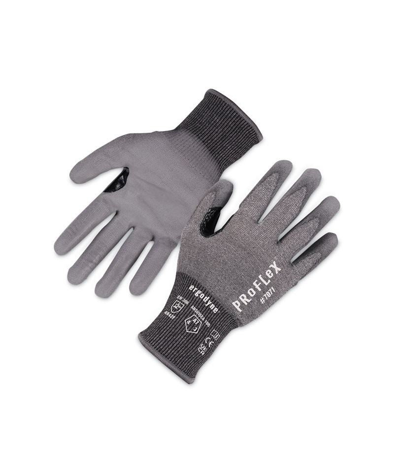 The ProFlex 7071 PU Coated Cut Resistant Gloves deliver a unique combination of incredibly high ANSI A7 cut resistance with a lightweight and flexible 18-gauge HPPE tungsten knit for no-bulk, form-fitting comfort. PU coated palms make for excellent grip and enhanced dexterity, while a reinforced thumb saddle boosts durability in high wear areas. The snug knit cuffs are longer than most on the market, a feature that enhances fit and extends protection while keeping dirt and debris out. The palms of these safety gloves are dipped in PU (polyurethane), a strong but flexible coating that delivers secure grip with enhanced dexterity on a variety of surfaces.