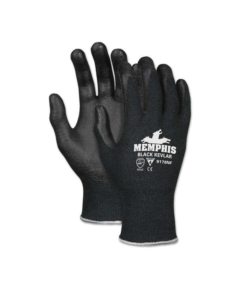 Durable Kevlar® gloves are an excellent choice for strength as well as cut and abrasion resistance. DuPont Kevlar® brand fiber is known for high tensile strength relative to its weight - up to five times stronger than steel. Sturdy gloves feature a 13-gauge Kevlar®/synthetic shell with a black nitrile foam coating on the palm and fingertips. Polymer coating for better grip and durability during tough jobs. Dark color hides dirt and grime, so gloves look better longer.