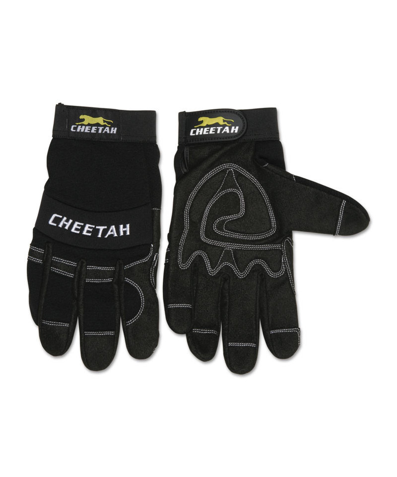 Cheetah multi-task gloves stand up to grease and grime, with a dark coloring that helps hide dirt. Sturdy gloves provide the grip, durability and protection for tough tasks. Black synthetic palm, hook and loop wrist closure, G shaped gel pad in palm.