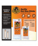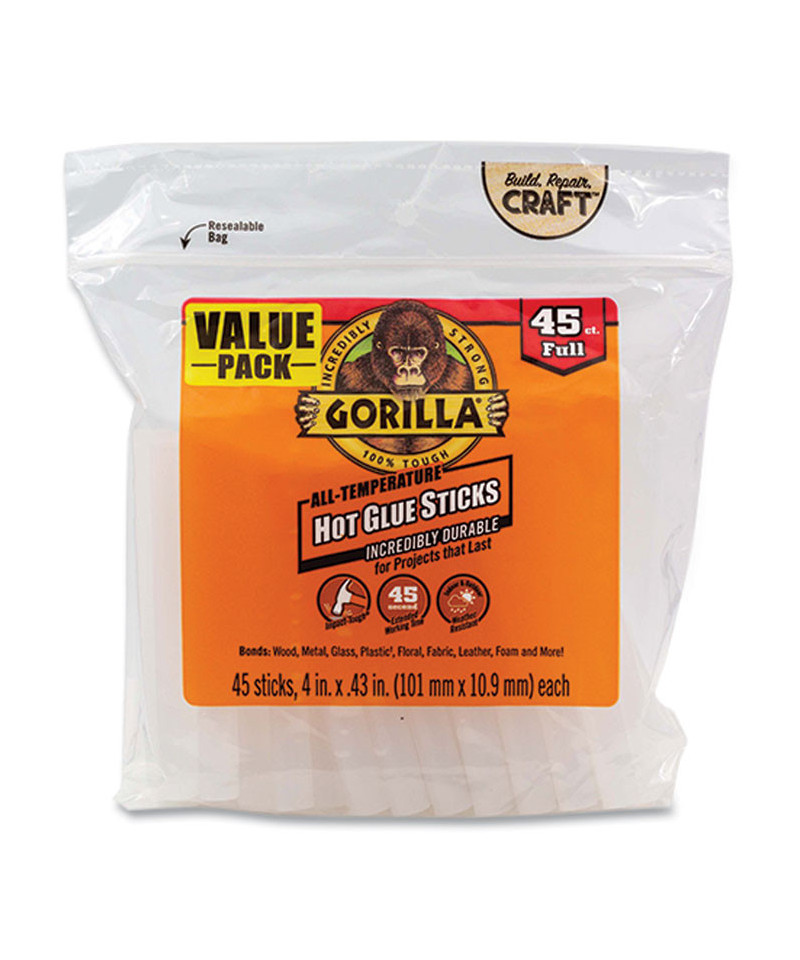 Incredibly tough and versatile, the Gorilla hot glue stick provides a long-term hold even on hard-to-bond surfaces. The clear adhesive works with both high- and low-temperature glue guns and features an extended working time for added convenience for all types of projects. Weather-resistant and incredibly durable to keep projects safe from seasonal temperature swings that can cause other glues to fail.