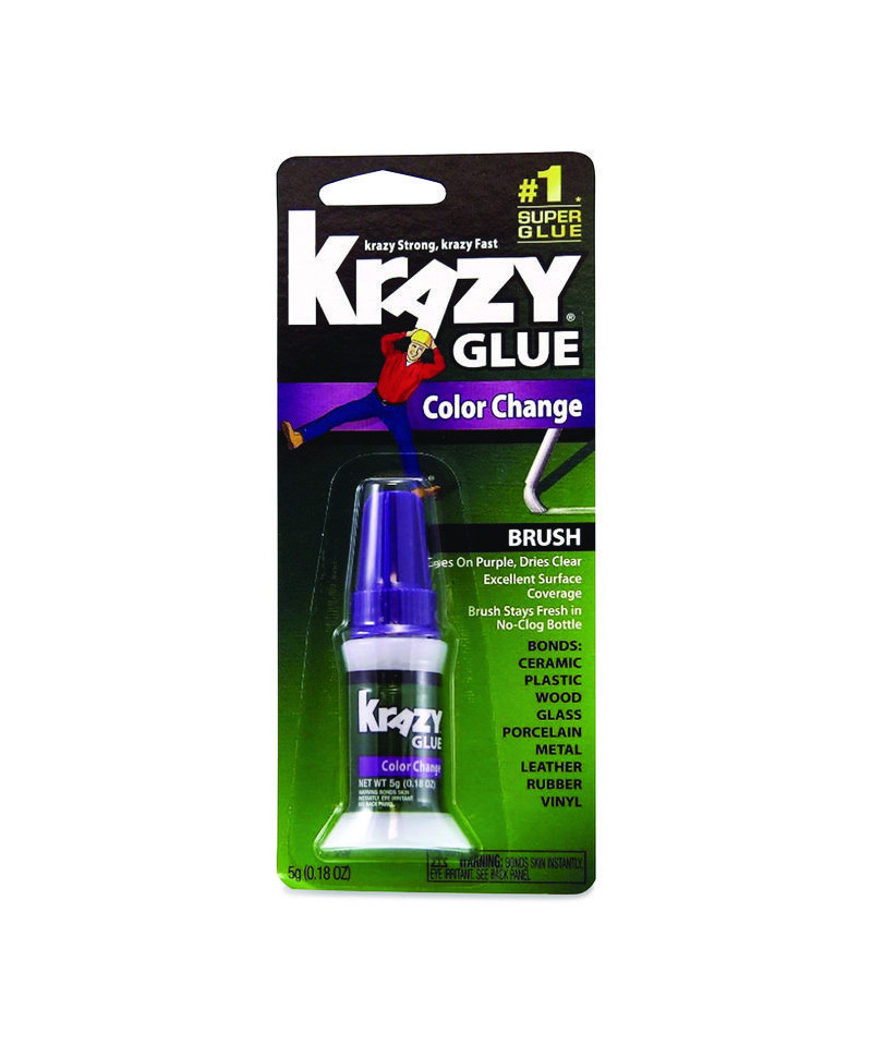 Color change brush-on glue offers an instant bond that stays strong on various surfaces such as wood, metal, ceramic, rubber, vinyl, leather and plastic. Brush-on applicator offers superior surface coverage that facilitates control on large surfaces and in hard-to-reach areas. Goes on purple so it's easy to see and then dries clear. Brush stays fresh in the no-clog bottle and the bristles of the brush do not stick together for hassle-free use.