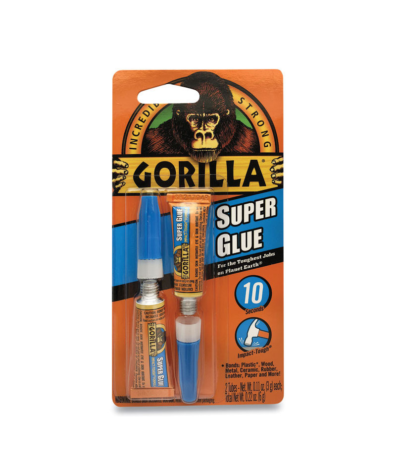 High strength and quick set time make Gorilla Super Glue the go-to for a variety of projects. Developed for long-lasting repairs in an instant, and designed with an impact-tough formula to handle bumps and drops with a strong, reliable bond. Anti-clog cap keeps glue from drying out. Fast-setting and dries in 10-45 seconds with no clamping required. Versatile and bonds plastic, wood, metal, ceramic, rubber, leather, paper, and more. It's Gorilla Tough use after use.