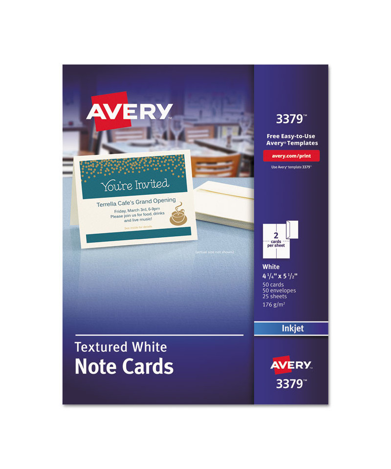 Create personalized note cards. Heavyweight cardstock is scored for easy folding, and matte coated for vivid graphics and sharp text. Envelopes included. Easy to customize with free designs and templates from Avery Design & Print. 8.5" x 11" sheets.