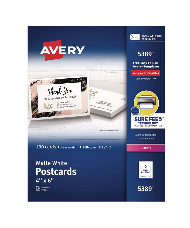 Create professional-looking invitations, announcements, reminders, seasonal offers and more. Sturdy bright white cardstock is either matte-coated for vivid graphics and sharp text or has a premium quality glossy finish ideal for photos. Ultra-fine perforations let you separate cards cleanly and easily. Meets U.S. postal regulations for postcards. Easy to customize with free templates and designs using Avery Design & Print Online. 8.5" x 11" sheets.