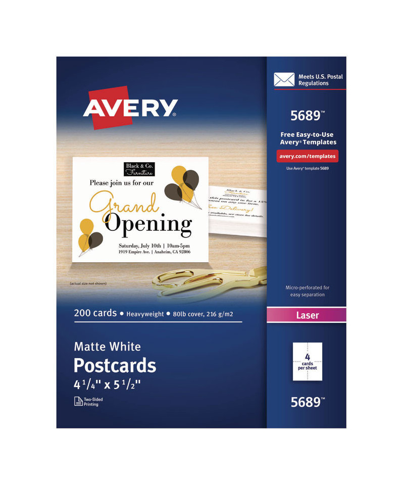 Create professional-looking invitations, announcements, reminders, seasonal offers and more. Sturdy bright white cardstock is either matte-coated for vivid graphics and sharp text or has a premium quality glossy finish ideal for photos. Ultra-fine perforations let you separate cards cleanly and easily. Meets U.S. postal regulations for postcards. Easy to customize with free templates and designs using Avery Design & Print Online. 8.5" x 11" sheets.
