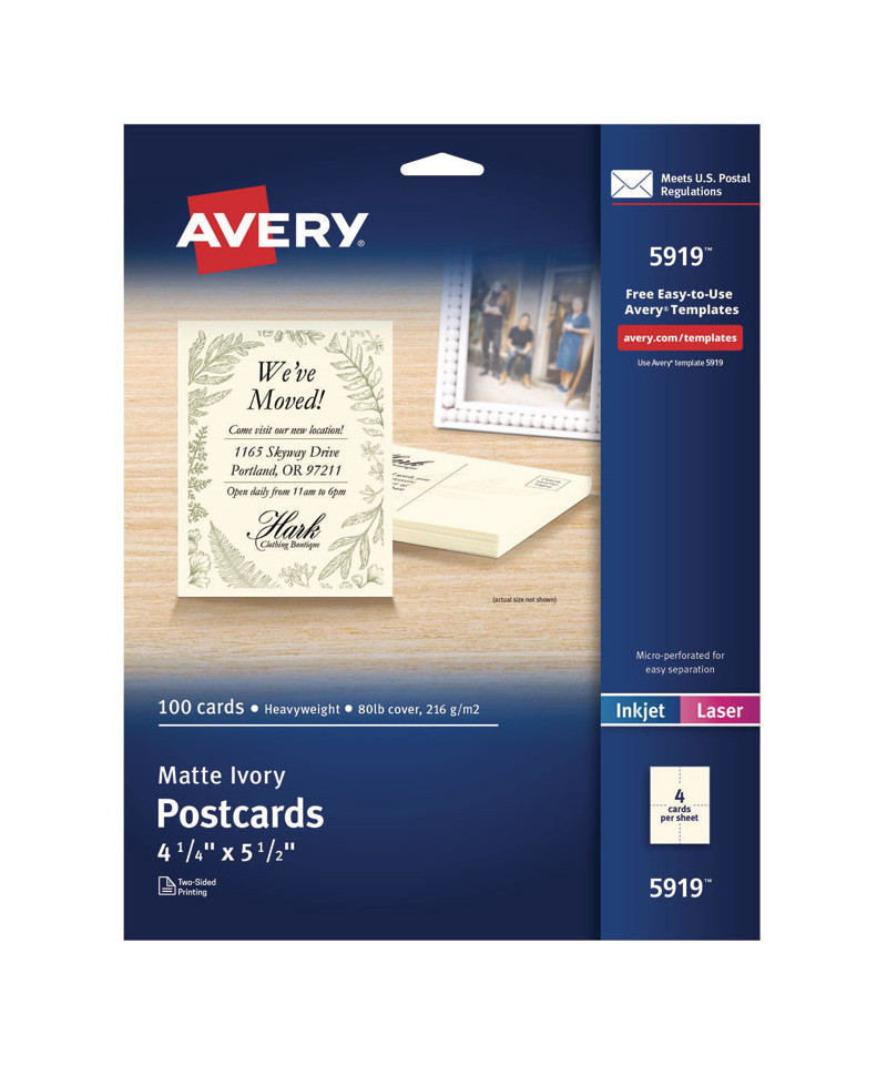 Do you have something to say? Spread the word with these sturdy bright white cards that work in your printer and are formatted to meet U.S. Postal regulations. Eye-catching engagement announcements, business ads, coupons and invitations are yours for the creating. Just use free templates from Avery Design & Print to combine color, graphics and text into a unique design. Then print and apply the required postage and let the postal service do the rest. Your recipients will receive professional-looking postcards worth talking about. Avery do-it-yourself printable postcards are thick and customizable and deliver superior, professional-looking print quality.