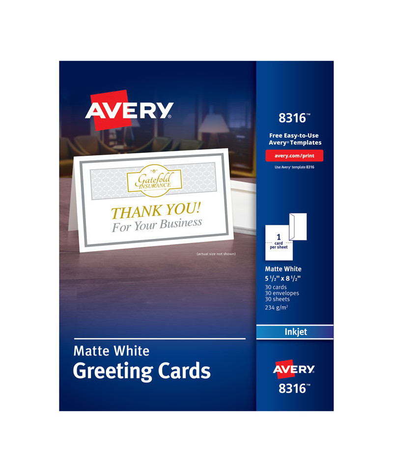 So you're fond of receiving invitations or season's greetings in the mail? Return the favor with a message of your own with these printable Greeting Cards. To get started, check out the wide selection of free designs and templates on Avery Design & Print or use your favorite digital photos for a personal touch. Design in portrait or landscape orientation and feed heavyweight card stock through your printer and watch as the high-resolution color makes images come to life. Cards are scored for easy folding and come with matching envelopes. Few things say "thinking of you" quite like a custom-made card. 8.5" x 11" sheets for inkjet printers.