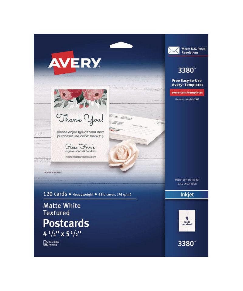 Create professional-looking invitations, announcements, reminders, seasonal offers and more. Sturdy bright white cardstock is either matte-coated for vivid graphics and sharp text or has a premium quality glossy finish ideal for photos. Ultra-fine perforations let you separate cards cleanly and easily. Meets U.S. postal regulations for postcards. Easy to customize with free templates and designs using Avery Design & Print Online. 8.5" x 11" sheets.