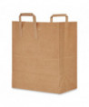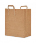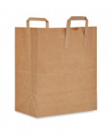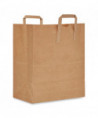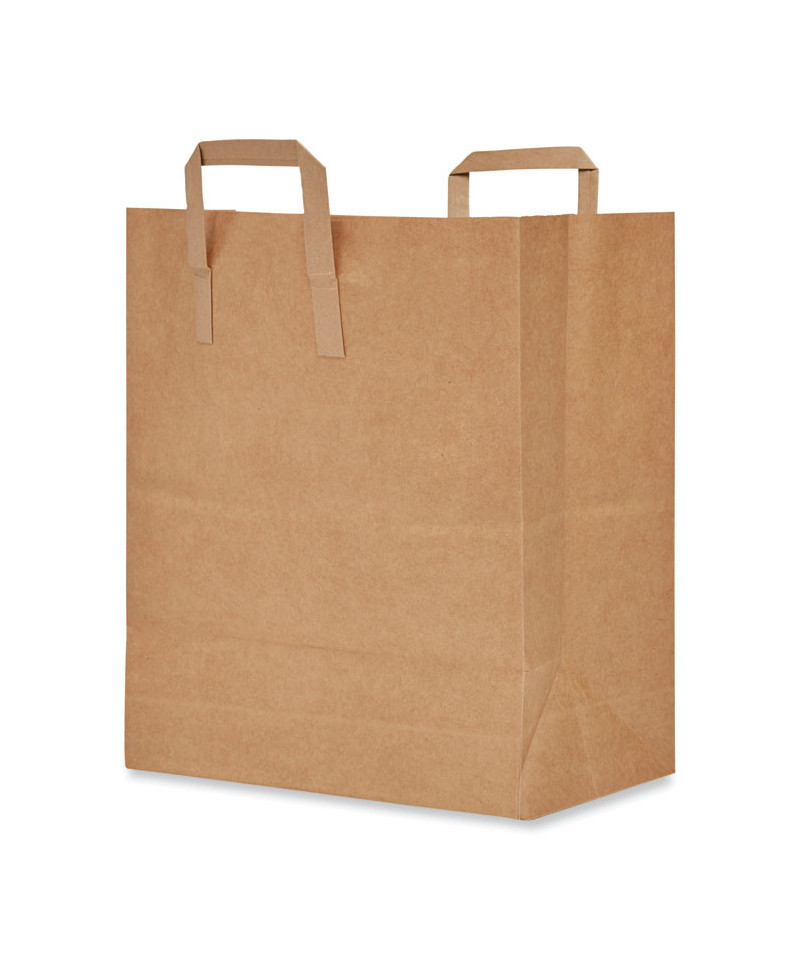 Kraft paper bag with handles for easy carrying. Durable construction for reliable containment. Flat bottom keeps items secure and allows bag to stand on its own.