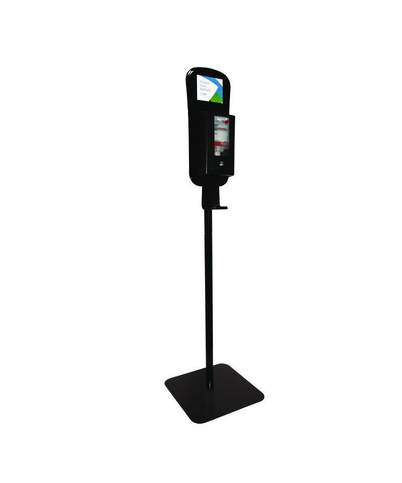 Encourages hand hygiene compliance and public health. Quick set-up with simple, intuitive mounting and two adjustable height positions. Attachable communication board provides customizable messaging and differentiation. Modern, discreet design blends in with any use environment. Smooth surface is easy to clean and reduces maintenance. Versatile design is adaptable for different needs and end users. Floor stand only, dispenser sold separately.