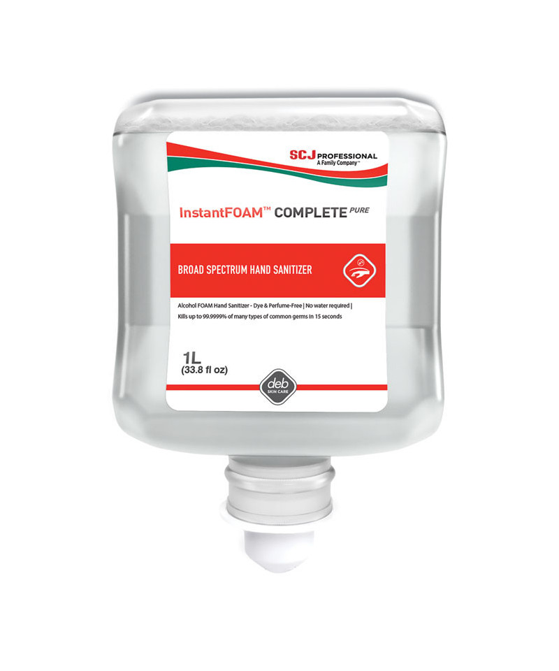InstantFoam Complete Pure alcohol based foaming hand sanitizer removes 99.999% of germs in 15 seconds when used as directed. Ideal for foodservice and long term facilities. This perfume and dye-free skin hypoallergenic hand sanitizer prevents skin dryness even during high-frequency usage. Latex, vinyl and nitrile glove compatible. Using patented Foam Technology™ the sanitizer is dispensed as a soft-structured foam and designed to be used without water, to provide a solution for hand sanitizing combining safety and preference with highly effective broad spectrum efficacy.