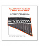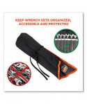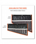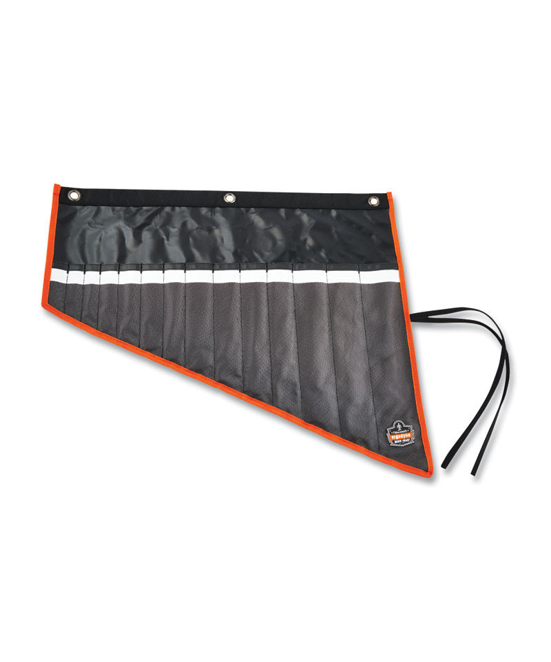 The Arsenal 5873 Wrench Organizer Roll Up features 14 gradually sized slots for convenient transport, easy organization and durable protection of wrench sets. For quick and clear differentiation, each slot features a customizable white label for writing the corresponding wrench size. Made with 1680D ballistic polyester, heavy-gauge nylon stitching and water-repellant finish to protect tools through the everyday grind. This space-saving wrench organizer rolls up and securely ties shut to stow neatly in trucks, buckets, work benches and more. The durable tie straps tightly close to prevent wrenches from spilling out, while also acting as a carrying handle for easy transport from site to site. Three nickel-plated grommets allow the organizer to be hung for convenient storage and access. .