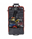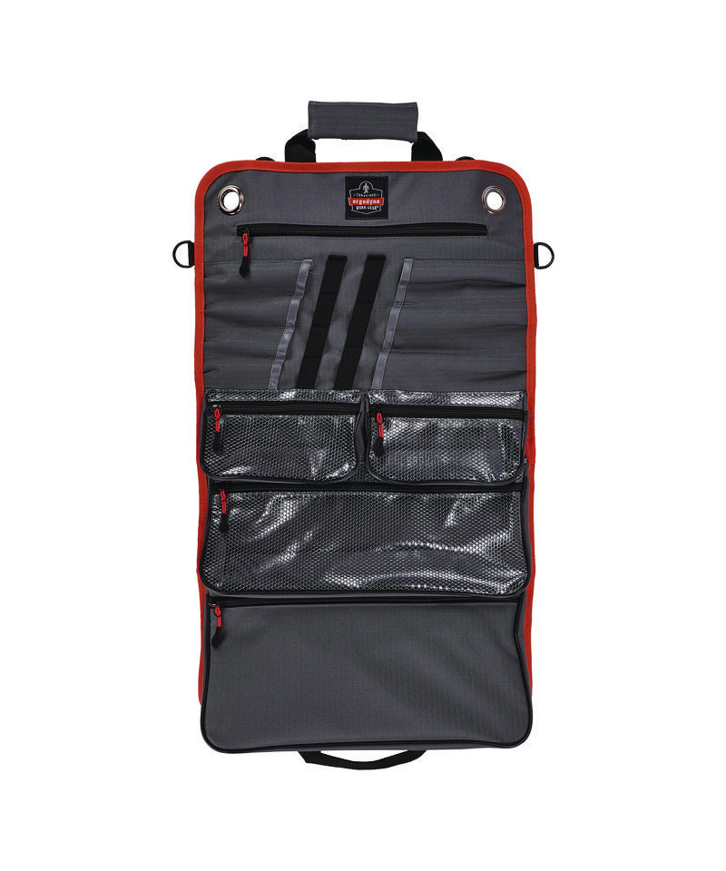 The Arsenal 5874 Roll Up Tool Bag features five zippered pockets and seven tool slots for convenient transport, easy organization and durable protection of hand tools. This roll up is designed with heavy-duty abrasion-resistant ripstop polyester to protect tools through the everyday grind. The inside of the tool roll features seven open-top slots with elastic webbing across the middle to secure screwdrivers, wrench, pliers and more. A small zippered pocket on the top stores personal items, while a larger zippered pocket on the bottom houses larger tools like hammers, drills and wrenches. Three clear zippered pockets are situated in the center of the tool roll-up, providing users with convenient visibility and easy access to their hardware and tools. Unroll the tool bag and lay it out on a work bench, use the side buckles to securely fasten around a workstation or vehicle headrest or hang from the two large grommets for easy tool access. This space-saving tool organizer rolls up and securely buckles shut to stow neatly in trucks, buckets, work benches and more. Adjustable cinch straps tighten to prevent tools from spilling out, while a durable carrying handle makes for easy to transport from site to site. This tool roll up is ideal for workers needing a compact solution for storing, organizing and transporting hand tools, including construction, carpentry, automotive, electrical and more. Also a great tool storage option for weekend hobbyists and DIY projects.