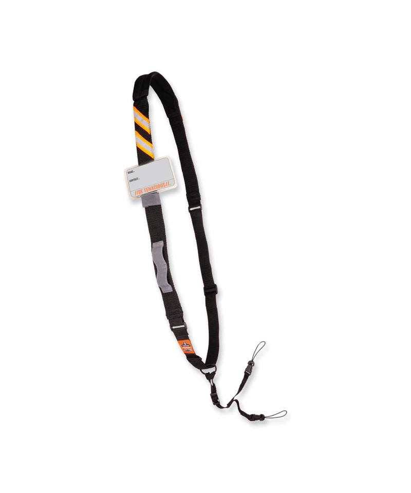 The Squids 3137 Padded Barcode Scanner Lanyard Sling keeps cordless QR and barcode scanners secure and easily accessible. Industrial-grade sash-style sling employs a heavy-duty webbing strap and ultra-durable buckles to withstand the harshest work environments. Airprene shoulder padding provides total wearing comfort, while a safety break-away, hook-and-loop design allows the sling to safely detach from the worker in emergency situations, minimizing the potential for getting caught up in dangerous machinery. One-size-fits-most format easily reconfigures for right- and left-handed workers. Hi-visibility reflective striping helps keep the wearer seen in low-light environments. Two small loop attachments on the sling easily connect and disconnect to the small captive holes built into most cordless scanners, and its modular format makes it easy switch out scanners for any scanner pre-equipped with a Squids 3133 Barcode Scanner Loop Attachment (additional loops sold separately). For added convenience, the sling also features a dedicated ID badge holder and pen loops. Hand wash with mild soap and water and then air dry.