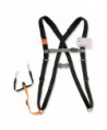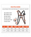 The Squids 3138 Padded Barcode Scanner Lanyard Harness keeps cordless QR and barcode scanners secure and easily accessible for warehouse and distribution workers. Industrial-grade harness utilizes heavy-duty webbing straps and buckles to ensure that the harness stands up to even the harshest working conditions. Curved, adjustable webbing straps conform to wearer's body, and Airprene shoulder padding delivers excellent, all-day wearing comfort. Emergency-breakaway design with a hook-and-loop back-release system allows the harness to safely detach from the worker in emergency situations, minimizing the potential for getting caught up in dangerous machinery. Fully adjustable system easily reconfigures for right- and left-handed workers. Two small loop attachments on the harness's lanyard strap easily connect and disconnect to the small captive holes built into most cordless scanners, and its modular format makes it easy switch out scanners for any scanner pre-equipped with a Squids 3133 Barcode Scanner Loop Attachment (additional loops sold separately). For added convenience, the harness also features a dedicated ID badge holder and pen loops. Hand wash with mild soap and water and then air dry.