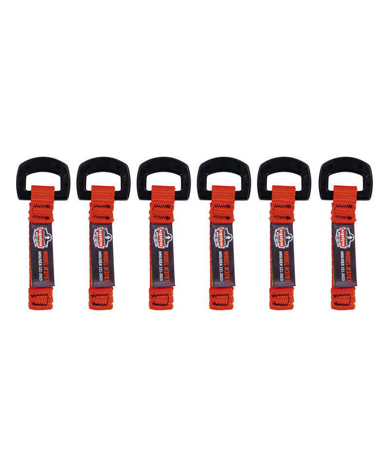 The Squids 3707 Web Tool Tether Attachments act as a retrofit attachment point to tether small hand tools up to 2 lbs and prevent dropped or falling objects from occurring on the job. Built for secure attachment to tools, this anchor attachment is made of heavy-duty nylon webbing and high-tensile strength nylon thread. Both ends feature a reinforced double-stitch web catch for a more durable stop. Once the base of the tail is securely taped to the tool or anchor point, the non-conductive D-ring acts as a captive hole for tethering tool lanyards and is safe to use when working around electrical circuits or heat. For best use, securely wrap the web tool tail between its catch points with Squids 3755 Self-Adhering Tape Trap to capture (trap) it onto a tool. When working at heights, it's essential to tether your tools as part of your fall protection plan. These tool tether attachments are built to withstand defined weight limits and can easily be used by any worker to help avoid accidentally dropping objects that could cause damage, injuries or possibly death. Ideal for those who need to tether tools in sensitive environments with electrical and arc hazards, like construction, telecommunications, oil and gas, power generation, utilities, wind energy, manufacturing or other jobs at heights.