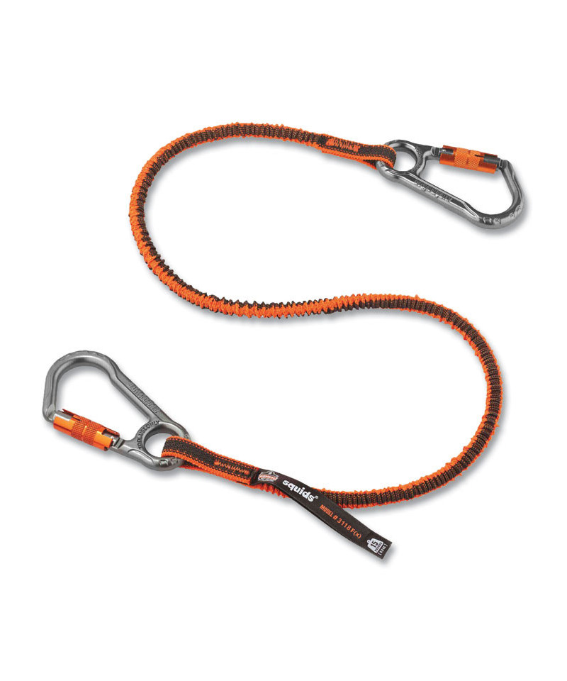 The Squids 3118F(x) Tool Lanyards with Locking Aluminum Carabiners features a patented design that prevents falling objects while absorbing any dynamic energy that might be transmitted through the lanyard's length to reduce any torque that your body, or anchor point, might experience if a drop occurs. By reducing this shock load, this tested and approved design prevents the tool from pulling the user down with it, effectively protecting everyone involved, both those above and those below. Durable, low-profile 1680 denier polyester, elastic-blend webbing with high-strength, three-ply nylon stitching on both ends ensures secure, reliable, lighter-weight performance, and the lanyard's single-length format eliminates the potential for the weak points commonly seen on multi-component lanyard alternatives. Both ends feature anodized, aluminum-alloy carabiners with an easy-grip, ergonomic format and double-action locking gates, making it easy to attach to tools or anchor points, even when wearing heavy work gloves. The carabiners' inherent captive-eye attachment points also help the user better predict the direction of loads to minimize the potential for the lanyard hooking into the carabiners' gates as well as minimize the potential for other related, dangerous lanyard issues. When working at heights, it's essential to tether your tools, and these tool lanyards are built to withstand defined weight limits and can easily be used by any worker to help avoid accidentally dropping objects that could cause extensive property damage and serious, potentially deadly injuries. This tool lanyard is third-party certified to a 15 lb maximum working capacity with a 2:1 safety factor.