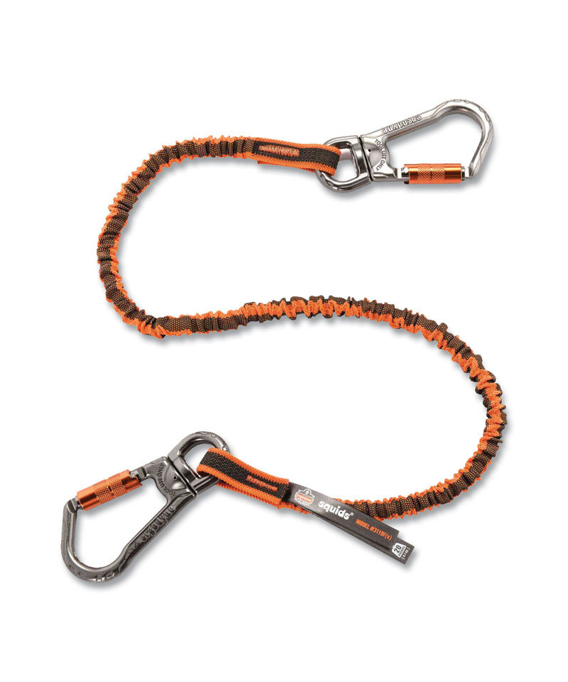 The Squids 3119F(x) Tool Lanyard with Locking Swivel-Action Aluminum Carabiners features a patented design that prevents falling objects while absorbing any dynamic energy that might be transmitted through the lanyard's length to reduce any torque that your body, or anchor point, might experience if a drop occurs. By reducing this shock load, this tested and approved design prevents the tool from pulling the user down with it, effectively protecting everyone involved, both those above and those below. Durable, low-profile 1680 denier polyester, elastic-blend webbing with high-strength, three-ply nylon stitching on both ends ensures secure, reliable, lighter-weight performance, and the lanyard's single-length format eliminates the potential for the weak points commonly seen on multi-component lanyard alternatives. Both ends feature anodized, aluminum-alloy swivel carabiners with an easy-grip, ergonomic format and double-action locking gates, making it easy to attach to tools or anchor points, even when wearing heavy work gloves. The carabiners' inherent captive-eye attachment points also help the user better predict the direction of loads to minimize the potential for the lanyard hooking into the carabiners' gates as well as minimize the potential for other related, dangerous lanyard issues, while their swivel-action format adds greater versatility for a wide range of scenarios. When working at heights, it's essential to tether your tools, and these tool lanyards are built to withstand defined weight limits and can easily be used by any worker to help avoid accidentally dropping objects that could cause extensive property damage and serious, potentially deadly injuries. This tool lanyard is third-party certified to a 25 lb maximum working capacity with a 2:1 safety factor.