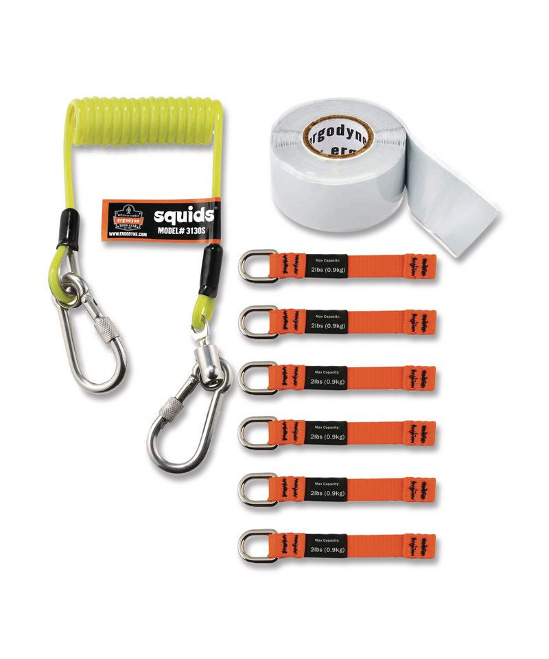 The Squids 3180 Tool Tethering Kit makes it easy to use a broad array of tools, while helping you do your part to prevent dropped objects while you work at heights. The included 3130S Coiled Cable Lanyard features a PU-covered aircraft-cable design with swiveling stainless-steel carabiners on both ends. Since it can be a challenge to connect tool lanyards to small hand tools, the kit also contains 3700 Web Tool Tethers and 3755 Self-Adhering Tool Traps, both of which are ideal for setting up retrofitted tool-attachment points. Whether you're looking to keep pliers, claw hammers, cat's paws, utility knives, saws, nips or trowels near, this kit may be the solution for you. Kit is third-party certified to a 2 lb maximum working capacity with a 2:1 safety factor.