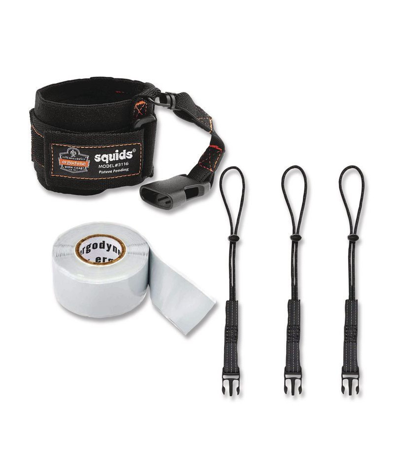 Central to the Squids 3192 Wrist Lanyard Tethering Kit is the 3116 Pull-On Wrist Lanyard with Buckle. This handy lanyard features a one-size-fits-all format and elastic-material construction to ensure a snug, secure fit for all users. Modular quick-connect buckle allows the wearer to easily attach any compatible tool-tail equipped item, and the included Squids 3103 Detachable Tool Tail Cinch-Loops make it easy for you to set up several tools for easy exchanges. Since connection points for tool lanyards are not always readily available on hand tools, which can create a hazardous environment while working at heights if the issue is ignored, this kit also includes the Squids 3755 Self-Adhering Tool Trap to help you ensure your retrofitted tool connections are secure. Kit is third-party tested to a maximum safe-working capacity of 3 lb with a 2:1 safety factor.