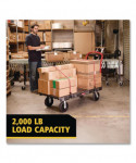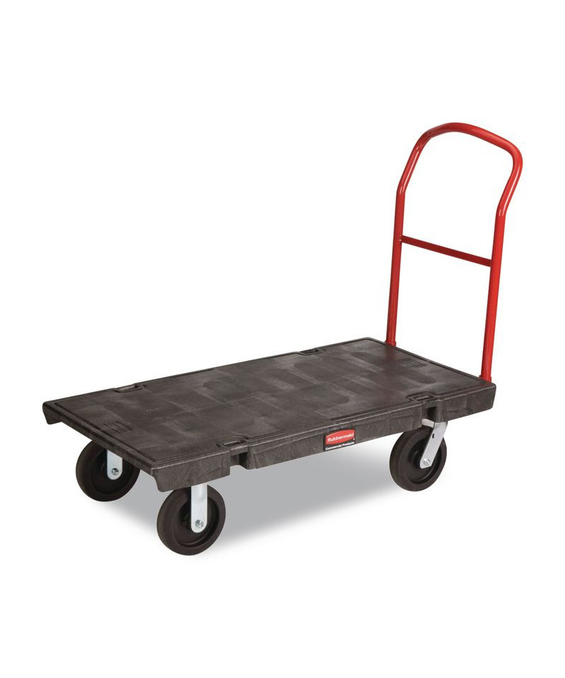 The Rubbermaid Commercial Heavy-Duty Platform Truck is constructed from Duramold resin and metal composite for durability and strength. The platform truck cart has a 2,000-pound capacity. Featuring molded-in tie-down slots and a textured surface to keep loads secure during transport. The platform cart has 2 fixed casters and 2 swivel casters to improve maneuverability.