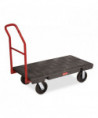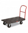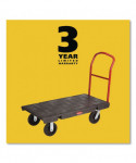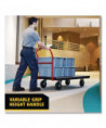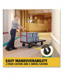 The Rubbermaid Commercial Heavy-Duty Platform Truck is constructed from Duramold resin and metal composite for durability and strength. The hand truck has a 500-pound capacity. The panel truck features molded-in tie-down slots and a textured surface to keep loads secure during transport. The hand truck has 2 fixed casters and 2 swivel casters to improve maneuverability.