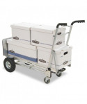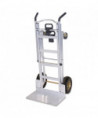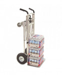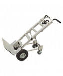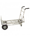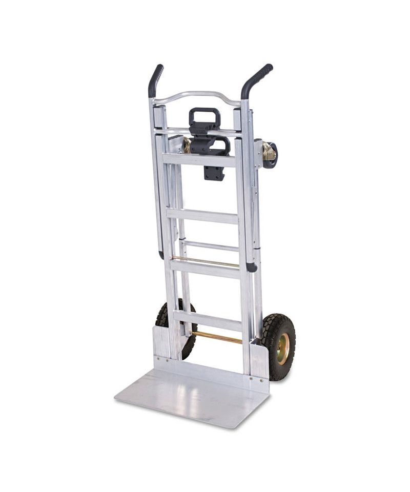 This hand truck has an easy one-hand conversion for 3 different uses tool free in just seconds. Use as two wheel hand truck or convert to assisted hand truck or four wheel hand cart for heavy-duty loads. Perfect for transporting supplies or equipment in any commercial environment. Features include lightweight commercial-grade aluminum frame, wheel guards that protect cargo from contacting the wheels and a center cross bar which keeps load from falling during transport. Also features flat free foam tires.