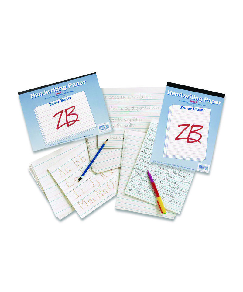 Rulings conform to Zaner-Bloser™ and/or D'Nealian™ handwriting programs. Bright tablet paper ruled on both sides with red baselines, blue dotted midlines and blue headlines.