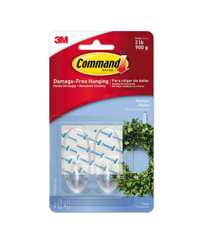 Command™ Damage-Free Hanging—holds strongly, removes cleanly. Forget about nails, screws and tacks, these clear hooks are easy to hang, support a surprising amount of weight and keep your surfaces looking beautiful. They're also nearly invisible, blending into their surroundings, so they don't distract from your decor. Included adhesive strips stick to many surfaces: tile, wood, metal, painted surfaces and more, but they also remove cleanly, leaving no holes, marks, sticky residue or damage behind. Remove and reuse them again and again!
