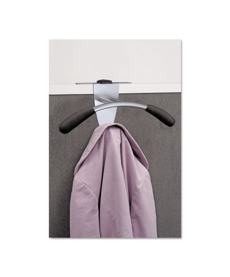 Hook/hanger combination with anti-slip foam and one black plastic coat peg. Keeps garments secure, clean and wrinkle-free. Adjustable to partition widths from 1 1/5" to 4 1/10".