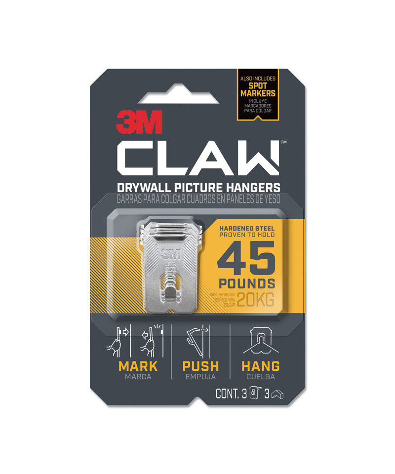 Trust your heavyweight hanging projects to the 3M™ CLAW Drywall Picture Hanger. The engineered hardened steel claws lock securely into drywall anywhere—just push, hang and you're done. No tools or studs needed. No big holes left in your drywall. Packs include a Spot Marker to mark where the mirror or art piece will hang before applying.