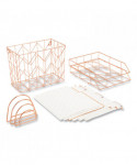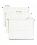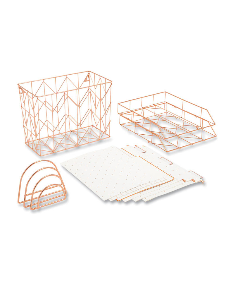Everything you need to stylishly manage your desktop filing and document sorting tasks. Attractive, polished metal-wire hanging file rack with matching document and mail sorters add a beautiful, all-of-a-piece modern touch to your workspace. Two stacking, horizontal document sorters make it easy to keep your frequently referenced and priority-project materials close at hand. Slim-profile letter sorter accommodates all your important and recently received snail mail. Basket-style hanging file folder rack can be placed on a desktop; or to save space, it can also be mounted to a wall (mounting hardware sold separately). Includes three Fashion Collection foil-accented hanging file folders and three matching standard file folders to get you started. All file folders are made of durable paper stock with reinforced tabs.