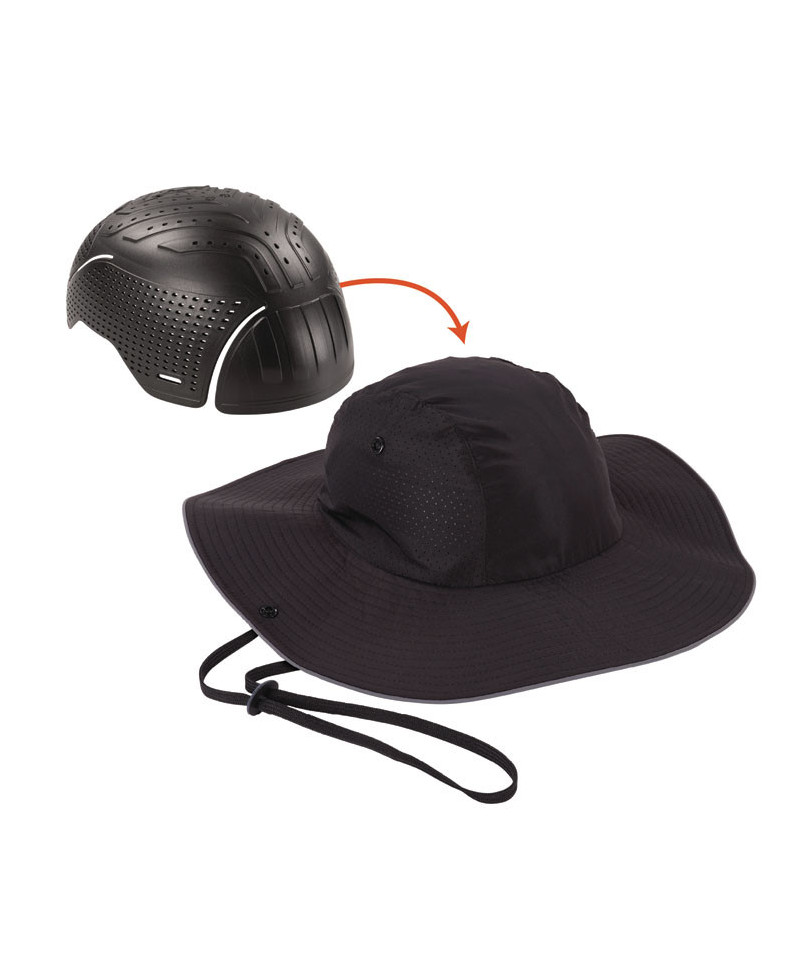 The Skullerz 8957 Lightweight Ranger Hat features the Skullerz 8943F(x) hinged impact-resistant bump cap insert for flexible, breathable protection against bumps, scrapes, bruises and other minor head injuries. The included drawstring chin cord has an integrated breakaway feature for a custom, secure fit with reduced risk of injury from snag hazards. This polyester hat is not stiff or bulky and provides lightweight, breathable head and face shade for working in the sun. Featuring a wide brim that can be worn down or snapped up and out of the way, this sun hat features laser-perforated side panels for maximized airflow. Designed with a buckle closure and adjustable rear sizing strap for a custom fit. Reflective accents and piping help ensure workers are seen in low-light conditions.