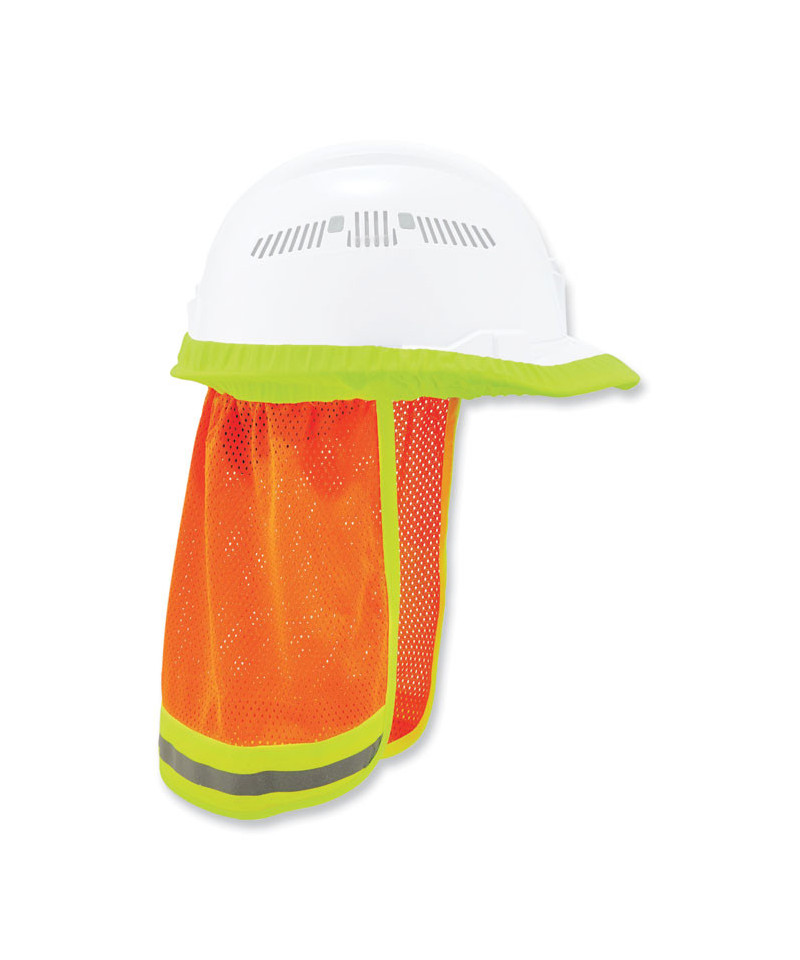 The GloWear 8005 Hi-Vis Hard Hat Neck Shade stretches around hard hat brims to provide breathable neck and ear protection from sun damage. Made with ANSI 107-approved polyester mesh and reflective, it enhances worker safety and visibility when worn as an accessory with other hi-vis clothing. The elastic design of this hard hat neck shade stretches to fit most standard and full brim hard hats and safety helmets, with additional plastic clips on the inside for stay-in-place security. This high-visibility neck shade is ideal for those wearing head protection while working in road construction, transportation, municipalities and more.