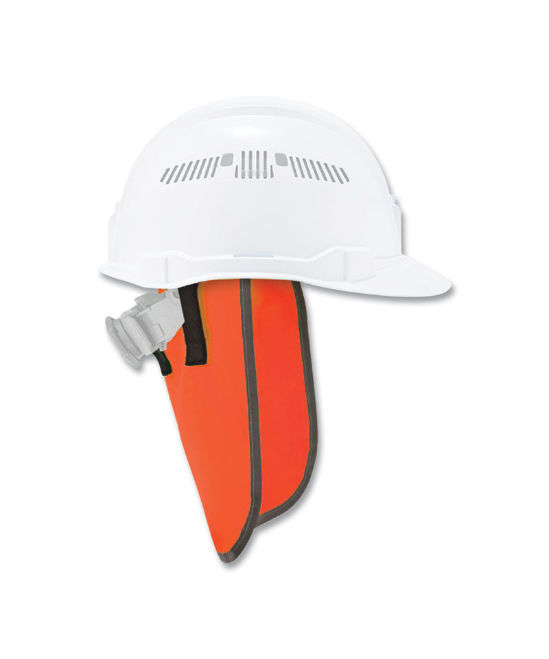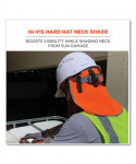 The hi-vis neck shade straps into hard hats to provide full back-of-neck protection from sun damage. Made with ANSI 107-approved polyester fabric and reflective trim, it enhances worker safety and visibility when worn as an accessory with other hi-vis clothing. This hard hat neck shade fits most hard hats and safety helmets, easily and securely attaching to the suspension with two hook and loop closures. This high-visibility neck shade is deal for those wearing head protection while working in road construction, transportation, municipalities and more.