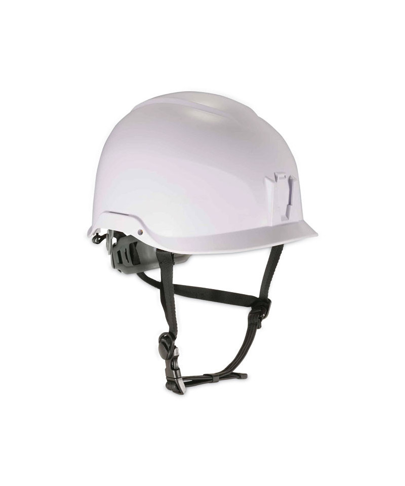 The Skullerz 8974 Class E (Electrical) Safety Helmet features a dielectric shell and a six-point suspension system to provide heavy-duty, yet lightweight and comfortable, all-over-head protection from top, side, front and back impacts as well as high-voltage system contacts. Its smaller, low-profile brim helps improve overall field of vision, particularly when looking up. A flexible, open-frame, multi-point adjustable-suspension design maximizes airflow for breathable, all-day wearing comfort, and a one-size-fits-most format accommodates those who wear hat sizes 6.5 through 8. A premium, easy-adjust ratcheting system allows the wearer to tighten or loosen the fit without having to take the helmet off, and its one-handed fit-adjustment knob pivots to improve overall ergonomics while providing extra clearance for bandana or ponytail knots. A padded, moisture-wicking, odor-resistant sweatband and top pad line the sides, forehead and top of the interior, and both the headband and top pad are removable for machine-washing and/or easy replacement. An integrated chin strap allows the wearer to secure the helmet in place to ensure protection during sudden movements, falls and impacts. Built with even weight-distribution and comfort in mind, all Skullerz 8974 helmets should deliver a snug, balanced fit to please nearly anyone. Patent-pending headlamp slots on the front and rear accommodate Skullerz Hard Hat Headlamps (lamps sold separately). For jobs where increased eye protection is needed, the helmet also accommodates easy, bolt-on mounting of Skullerz Safety Helmet Visors (visors also sold separately). From mountain-climbers to miners, from communication-tower technicians to pipefitters... whether you're on top of the world or deep within it, 8974 series safety helmets are designed to help you keep your head.
