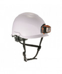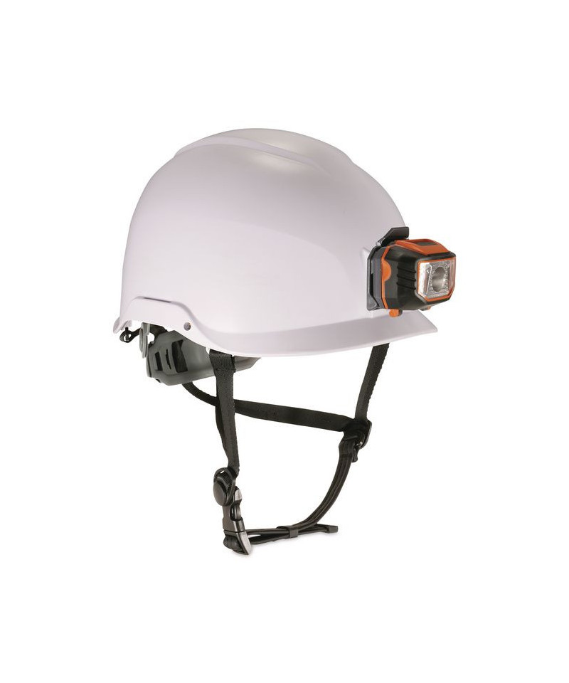 The Skullerz 8974LED Class E (Electrical) Safety Helmet features a dielectric shell and a six-point suspension system to provide heavy-duty, yet lightweight and comfortable, all-over-head protection from top, side, front and back impacts as well as high-voltage system contacts. Its smaller, low-profile brim helps improve overall field of vision, particularly when looking up, and patent-pending headlamp slots on the front and rear of the exterior accommodate Skullerz Hard Hat Headlamps. One Skullerz 8981 Universal LED Headlamp is included to help you keep your path and the object of your attention illuminated. The helmet's flexible, open-frame, multi-point adjustable-suspension design maximizes airflow for breathable, all-day wearing comfort, and a one-size-fits-most format accommodates those who wear hat sizes 6.5 through 8. A premium, easy-adjust ratcheting system allows the wearer to tighten or loosen the fit without having to take the helmet off, and its one-handed fit-adjustment knob pivots to improve overall ergonomics while providing extra clearance for bandana or ponytail knots. A padded, moisture-wicking, odor-resistant sweatband and top pad line the sides, forehead and top of the interior, and both the headband and top pad are removable for machine-washing and/or easy replacement. An integrated chin strap allows the wearer to secure the helmet in place to ensure protection during sudden movements, falls and impacts. Built with even weight-distribution and comfort in mind, all Skullerz 8974 helmets should deliver a snug, balanced fit to please nearly anyone. For jobs where increased eye protection is needed, the helmet also accommodates easy, bolt-on mounting of Skullerz Safety Helmet Visors (visors sold separately). From mountain-climbers to miners, from communication-tower technicians to pipefitters... whether you're on top of the world or deep within it, 8974 series safety helmets are designed to help you keep your head.
