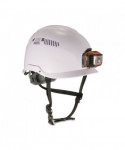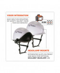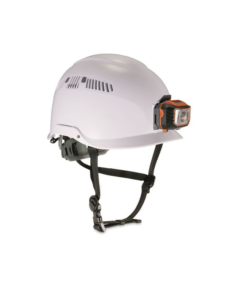 The Skullerz 8975LED Class C (Conductive) Safety Helmet with LED Headlamp features a unique, vented shell and a flexible, open-frame, six-point suspension system to provide heavy-duty, yet lightweight and comfortable, all-over-head protection from top, side, front and back impacts. Integrated, patent-pending headlamp slots on the front and rear of the exterior accommodate Skullerz Hard Hat Headlamps, and one Skullerz 8981 Universal LED Headlamp is included to help you keep your path and the object of your attention illuminated. Adjustable exterior venting allows the wearer to remain cool in hot, dry weather by opening the vents or to remain warm and dry in cold, wet weather by closing the vents. The compact shell's smaller, low-profile brim helps improve overall field of vision, particularly when looking up, and a one-size-fits-most format accommodates those who wear hat sizes 6.5 through 8. A premium, easy-adjust ratcheting system allows the user to tighten or loosen the fit without having to take the helmet off, and the rachet system's one-handed adjustment knob pivots to improve overall ergonomics while providing extra clearance for bandana or ponytail knots. A padded, moisture-wicking, odor-resistant sweatband and top pad line the sides, forehead and top of the interior, and both the headband and top pad are removable for machine-washing and/or easy replacement. An integrated chin strap allows the user to secure the helmet in place to ensure protection during sudden movements, falls and impacts. Built with even weight-distribution and comfort in mind, all Skullerz 8975 helmets should deliver a snug, balanced fit to please nearly anyone. For jobs where increased eye protection is needed, the helmet also accommodates easy, bolt-on mounting of Skullerz Safety Helmet Visors (visors sold separately). From mountain-climbers to spelunkers, from iron-workers to pipefitters... whether you're on top of the world or deep within it, 8975 series safety helmets are designed to help you keep your head.