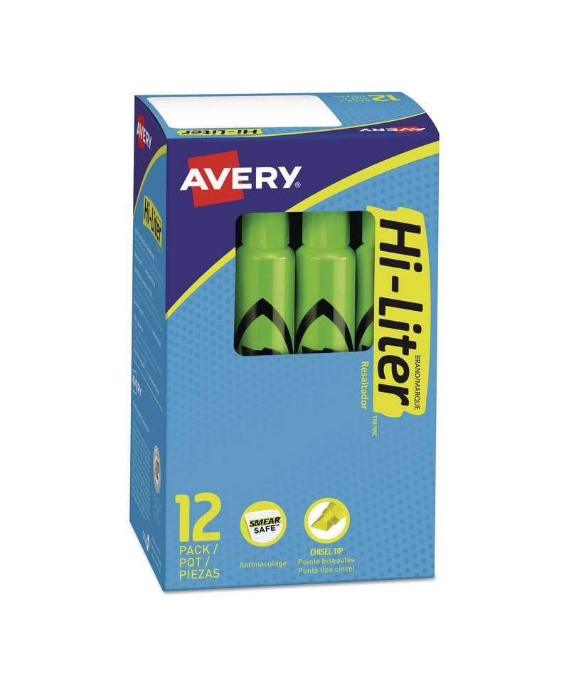 Study research materials, prepare documents or call attention to important information with Avery® HI-LITER Desk-Style Highlighters. Smear Safe, quick-drying ink provides reliable smear protection across most pen, marker and inkjet inks. Durable, fray-proof chisel tip accommodates both highlighting and underlining, while ensuring smooth performance. Highlighters can be left uncapped for up to one week without drying out. The water-based ink is easy to wash from skin.