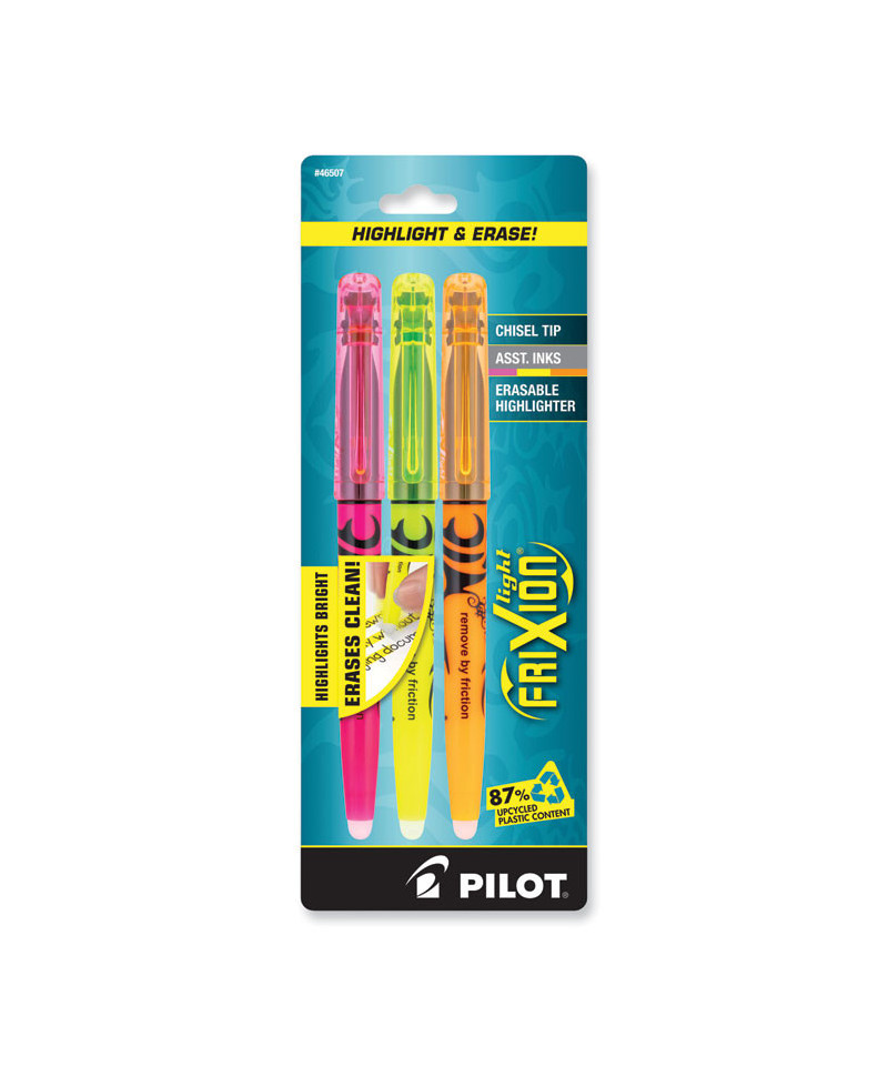 Erasable highlighter features thermo-sensitive ink formula that disappears with erasing friction. Bright, vibrant colors won't damage books or documents. Highlight and erase repeatedly without smudging or tearing paper.