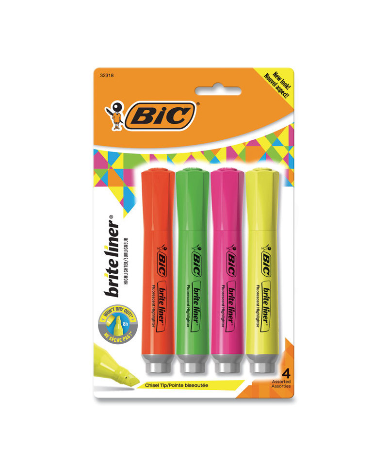 Whether you're organizing notes or underlining passages in a textbook, BIC Brite Liner Highlighters make highlighting a breeze. These tank-style highlighters deliver super-bright fluorescent ink to help emphasize the important parts of documents, books, and notes. Each highlighter creates marks that stand out on the page, and its chisel tip allows for smooth transitioning between precise underlines and broad coverage sweeps. Built with heavy use in mind, Each ACMI-approved, non-toxic highlighter contains a large supply of ink and won't dry out for up to eight hours If left uncapped. BIC Brite Liner Highlighters make highlighting fun and are great for use at home, school, or the office.
